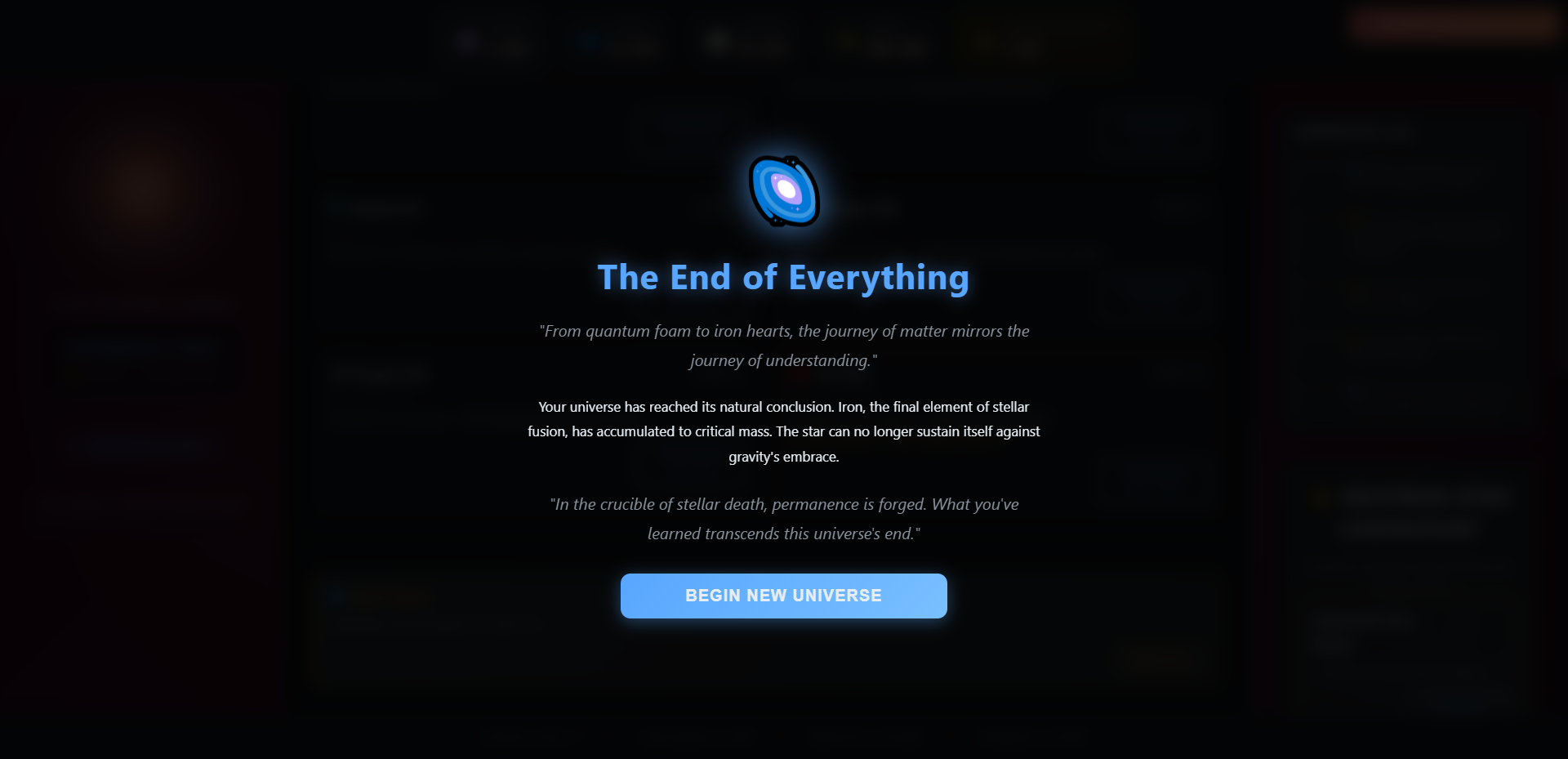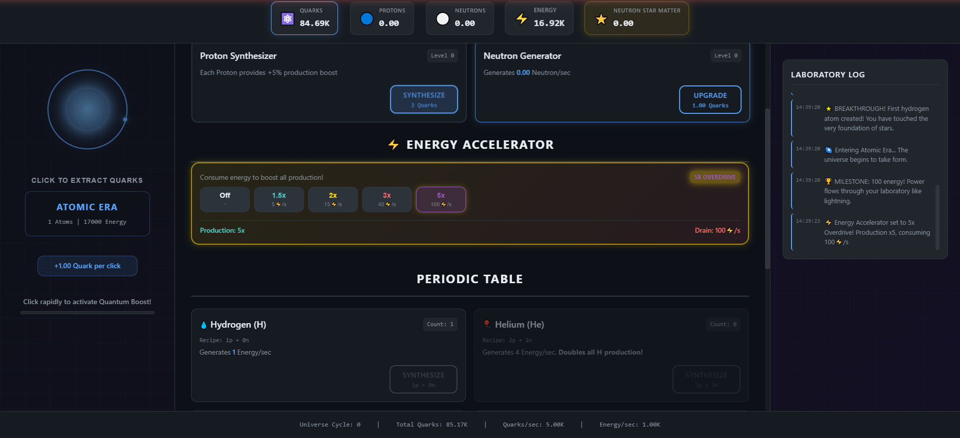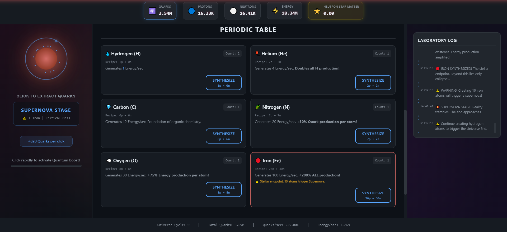 Start with nothing but clicks. Extract quarks from the quantum void, synthesize protons and neutrons, create elements from hydrogen to iron, and trigger a supernova to begin the cycle anew with permanent upgrades!